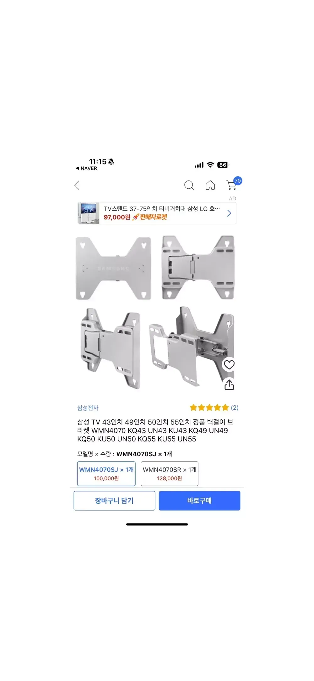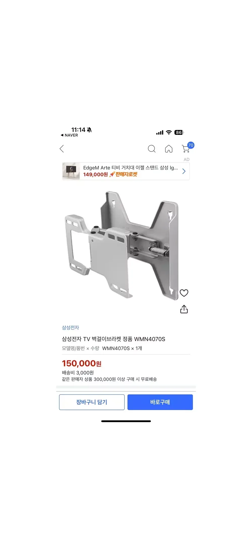 삼성정품 벽걸이 티비 브라켓 wmn4070s